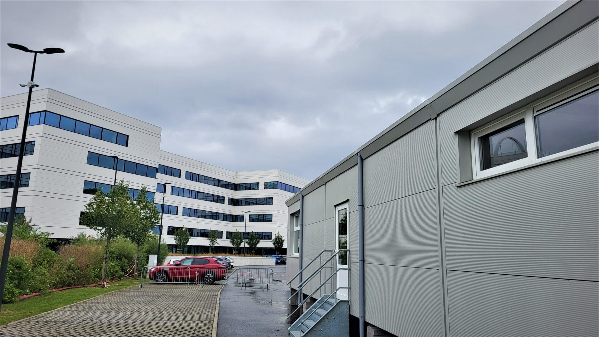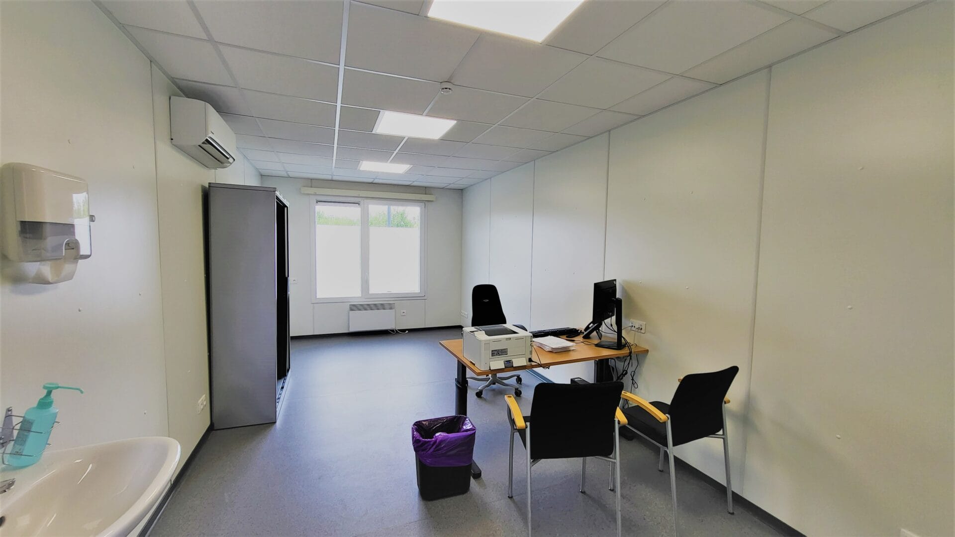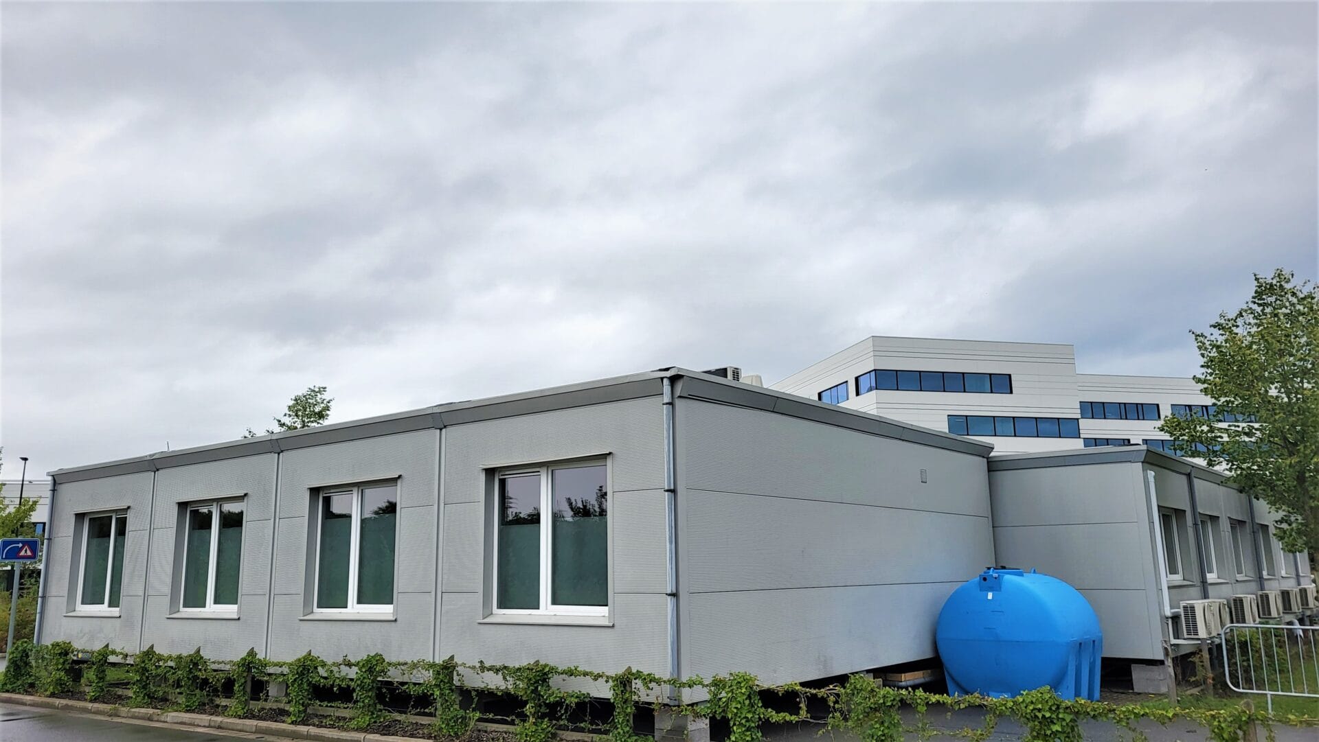 Placement rapide de 11 modules pour créer des bureaux de consultation pour le CHC Montlégia pour une période temporaire. Pompe à chaleur air/air, ventilation, sanitaires, mobilier, etc.