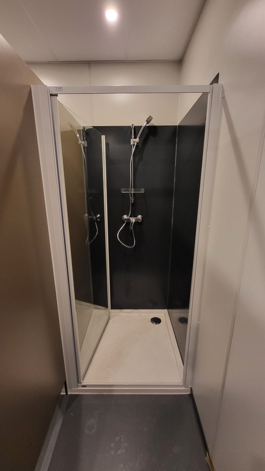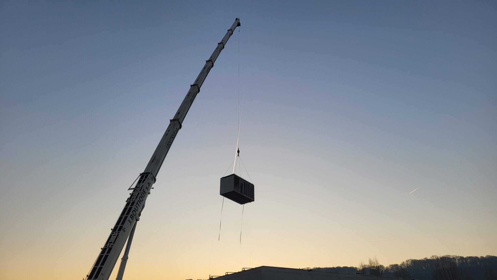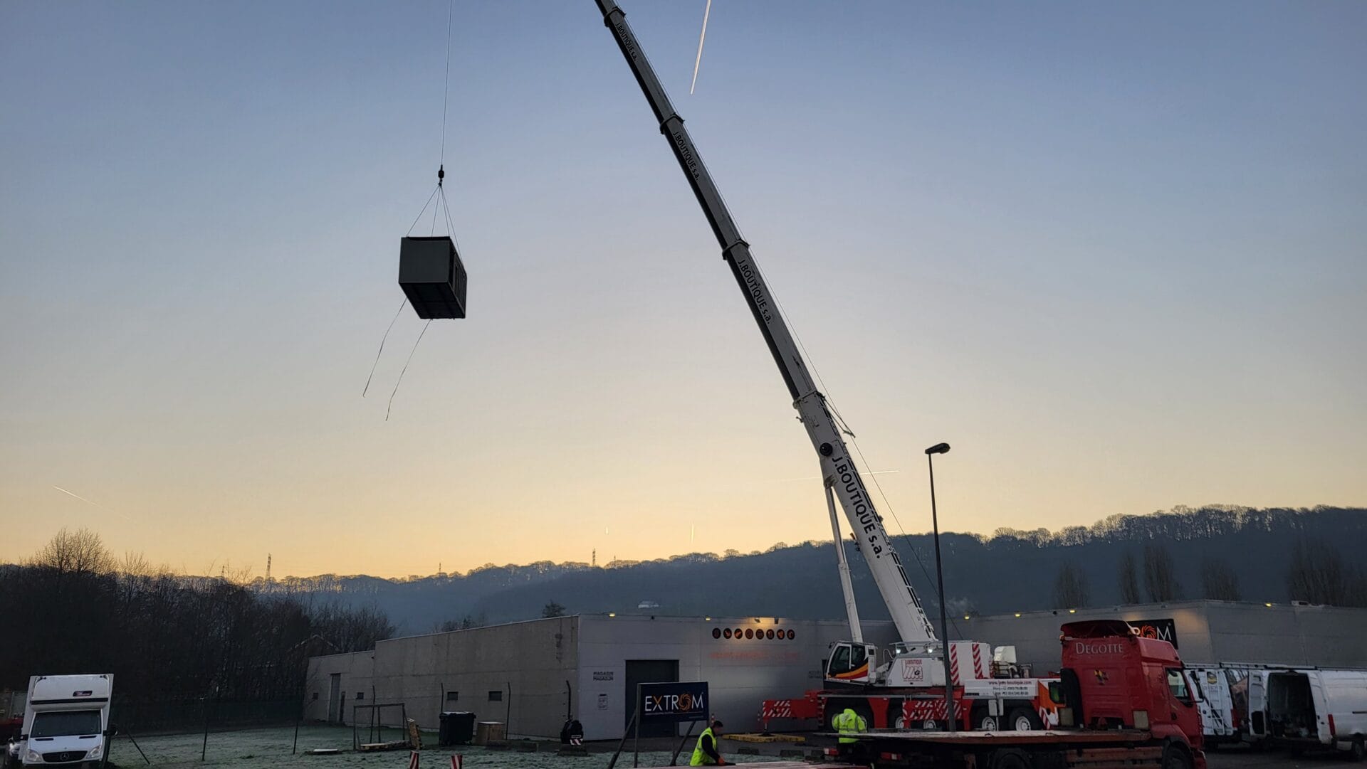 Construction modulaire avec connexion directe au bâtiment existant, sanitaires (douches, WC), réfectoire. Placement avec une grue 250T.