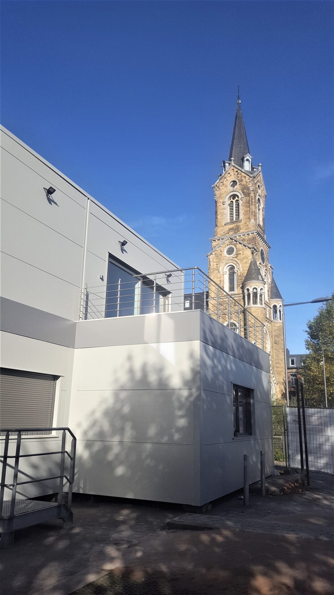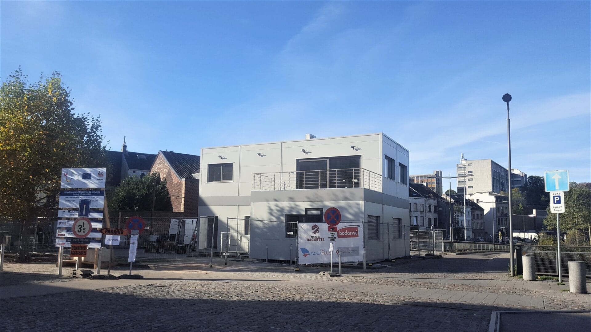 Bâtiment modulaire de type base vie placé en centre-ville et équipe de bureaux, salle de réunion, grandes baies vitrées, terrasse, sanitaires.