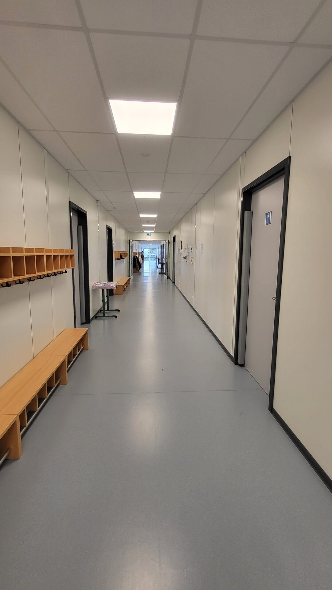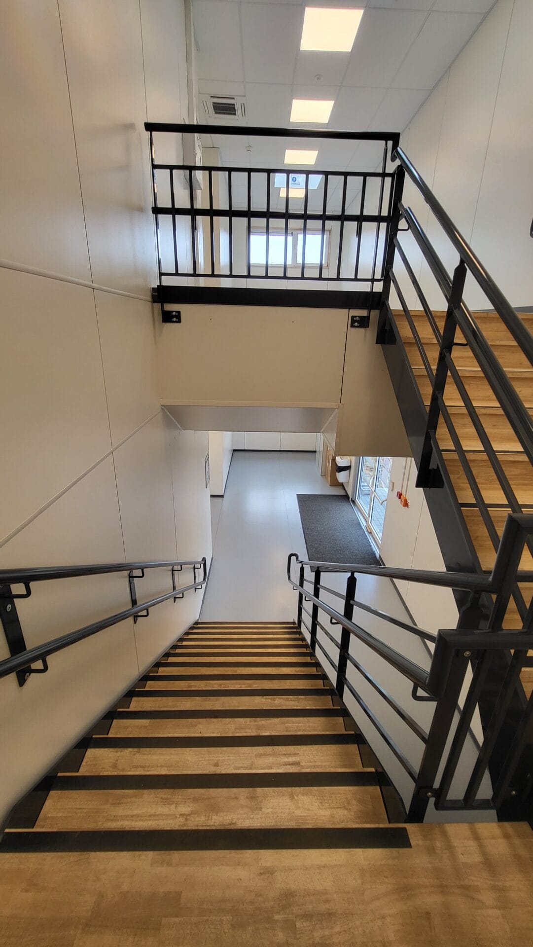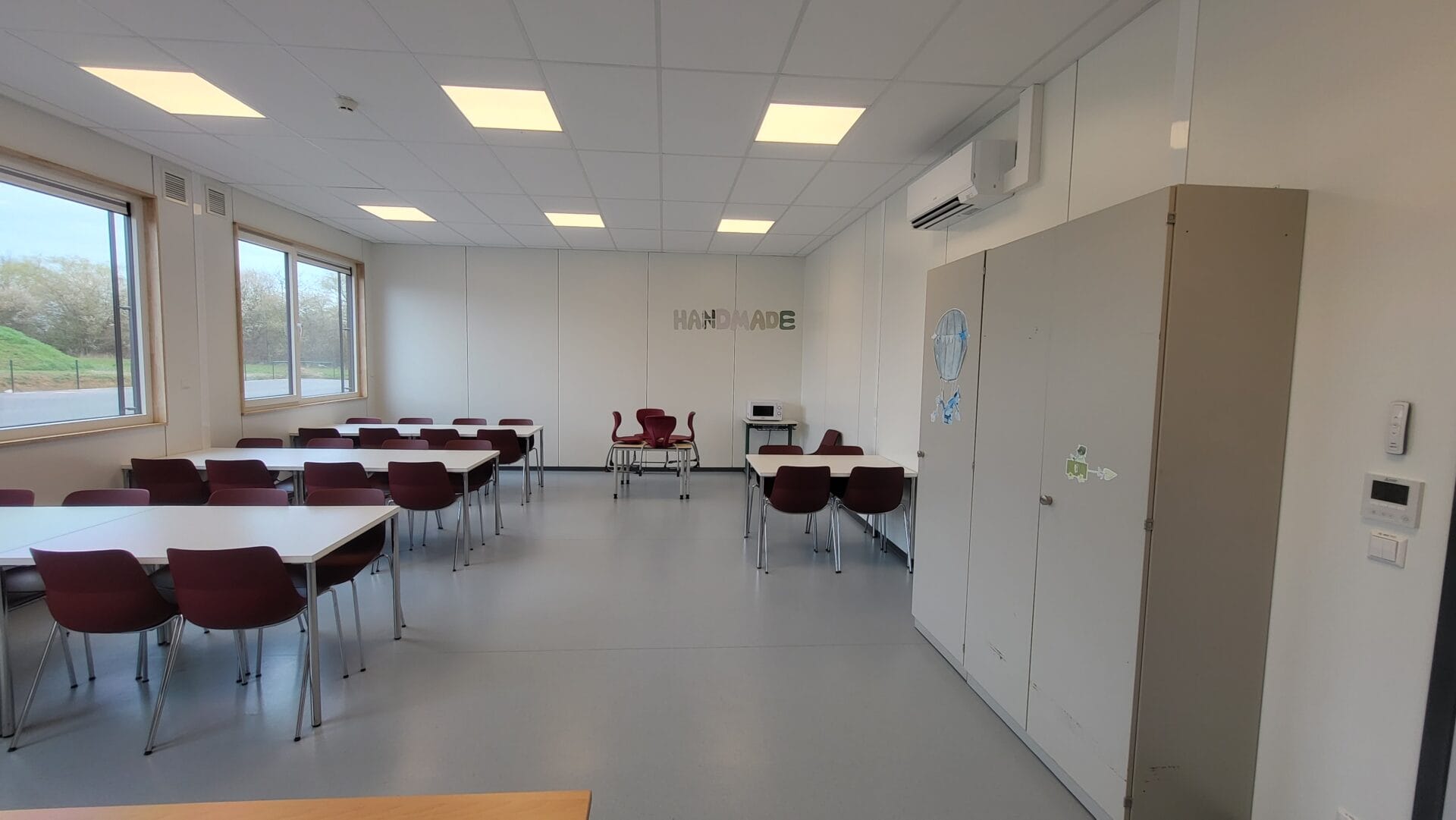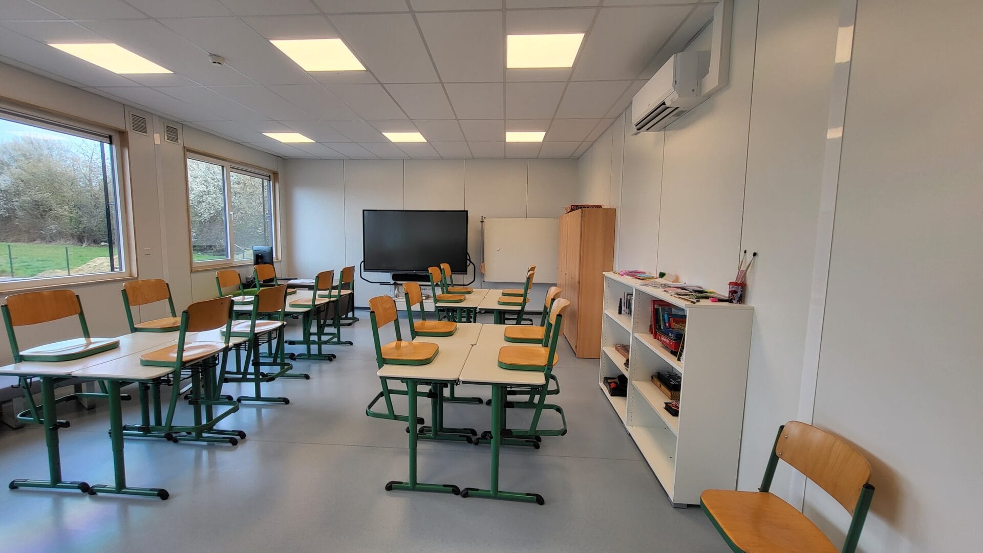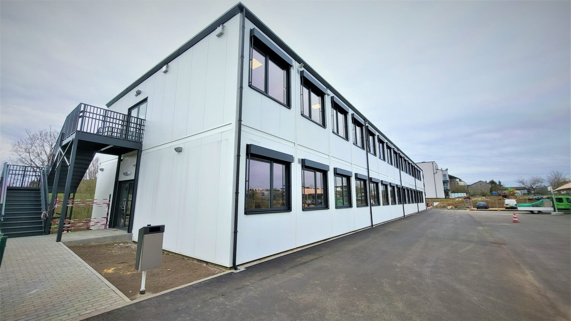 Bâtiment scolaire (classes, sanitaires, PMR, salle des professeurs,…) sur deux niveaux avec escaliers intérieur et extérieur, compartimentage RF, screens électriques, auvent