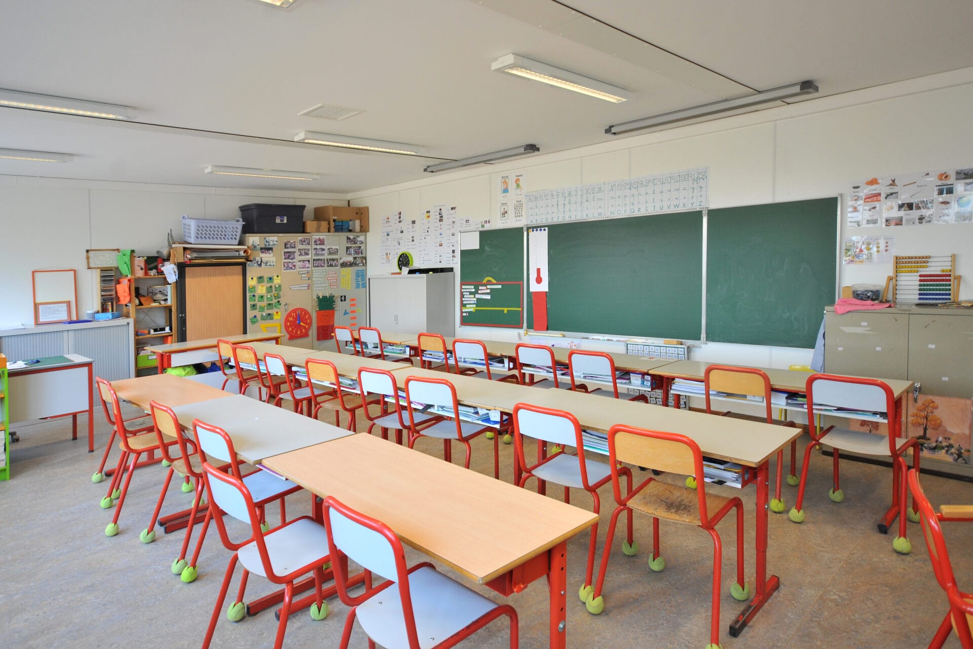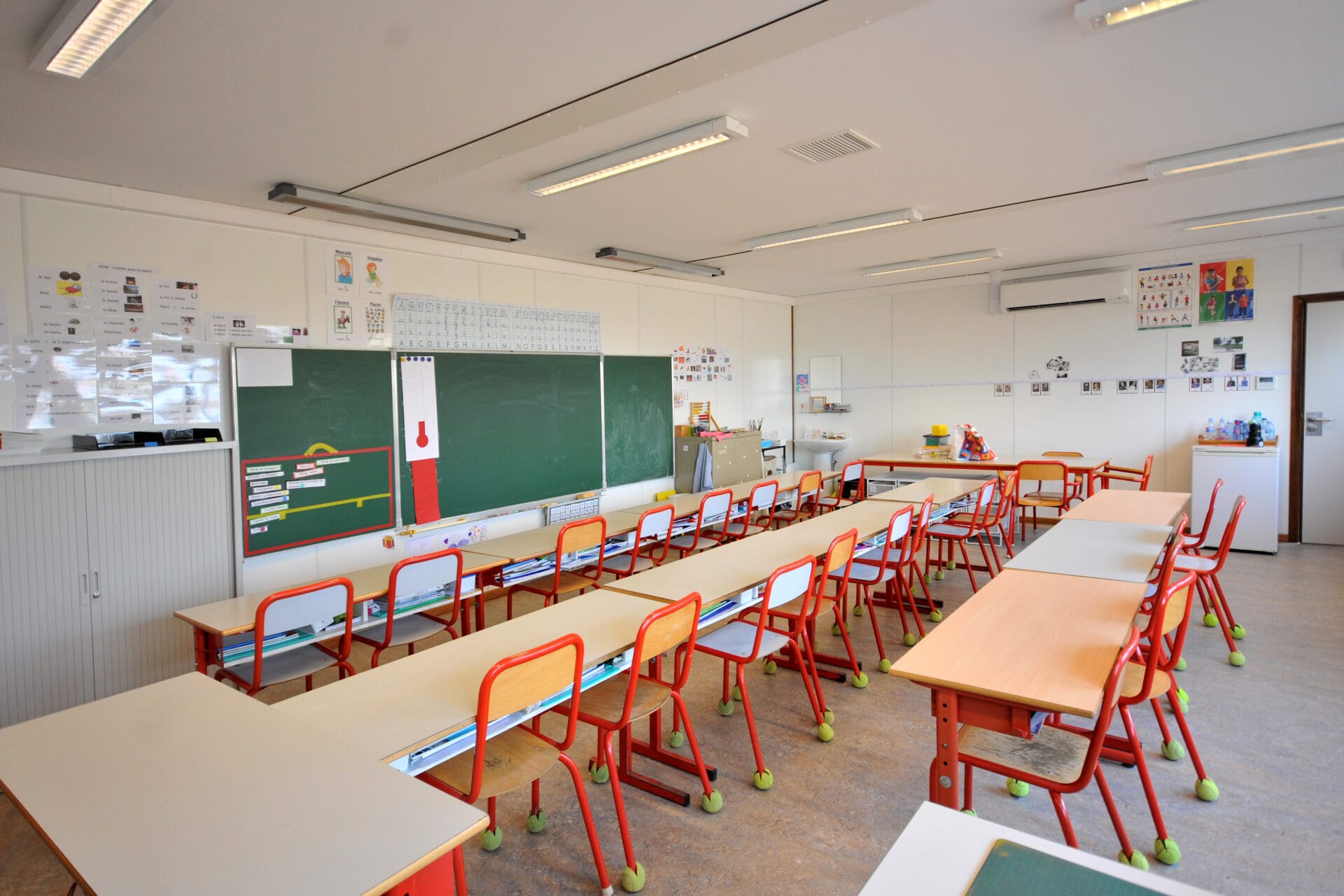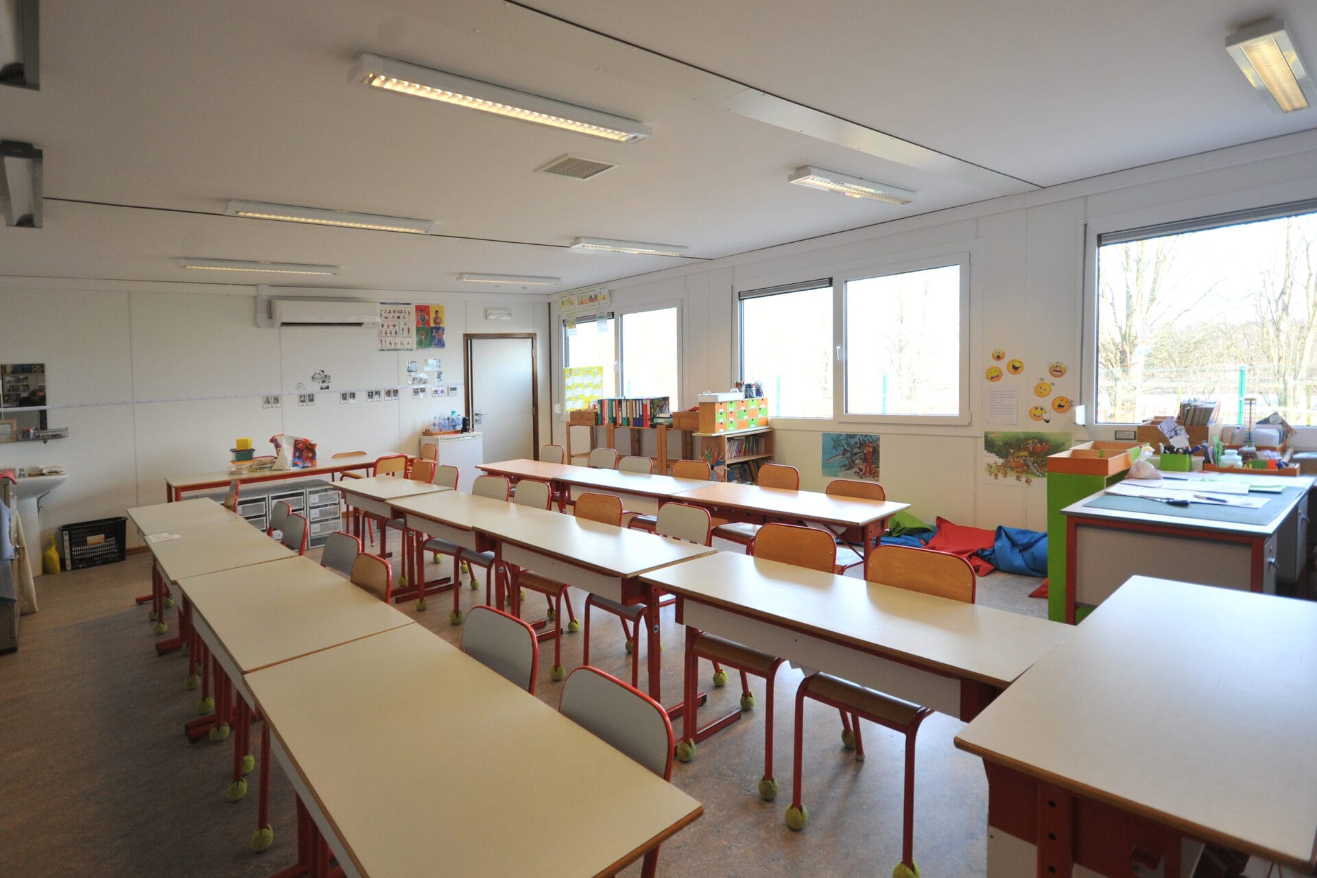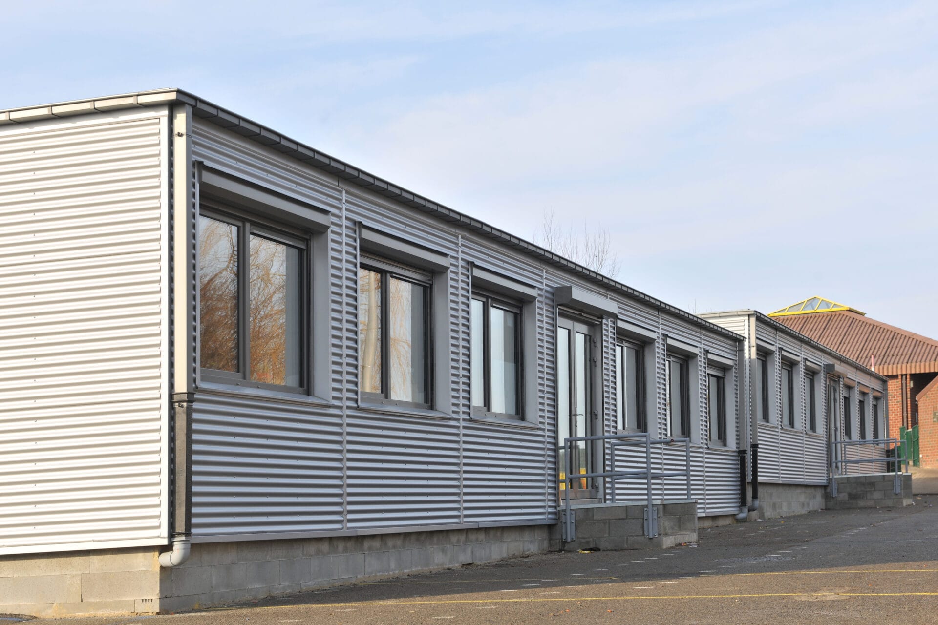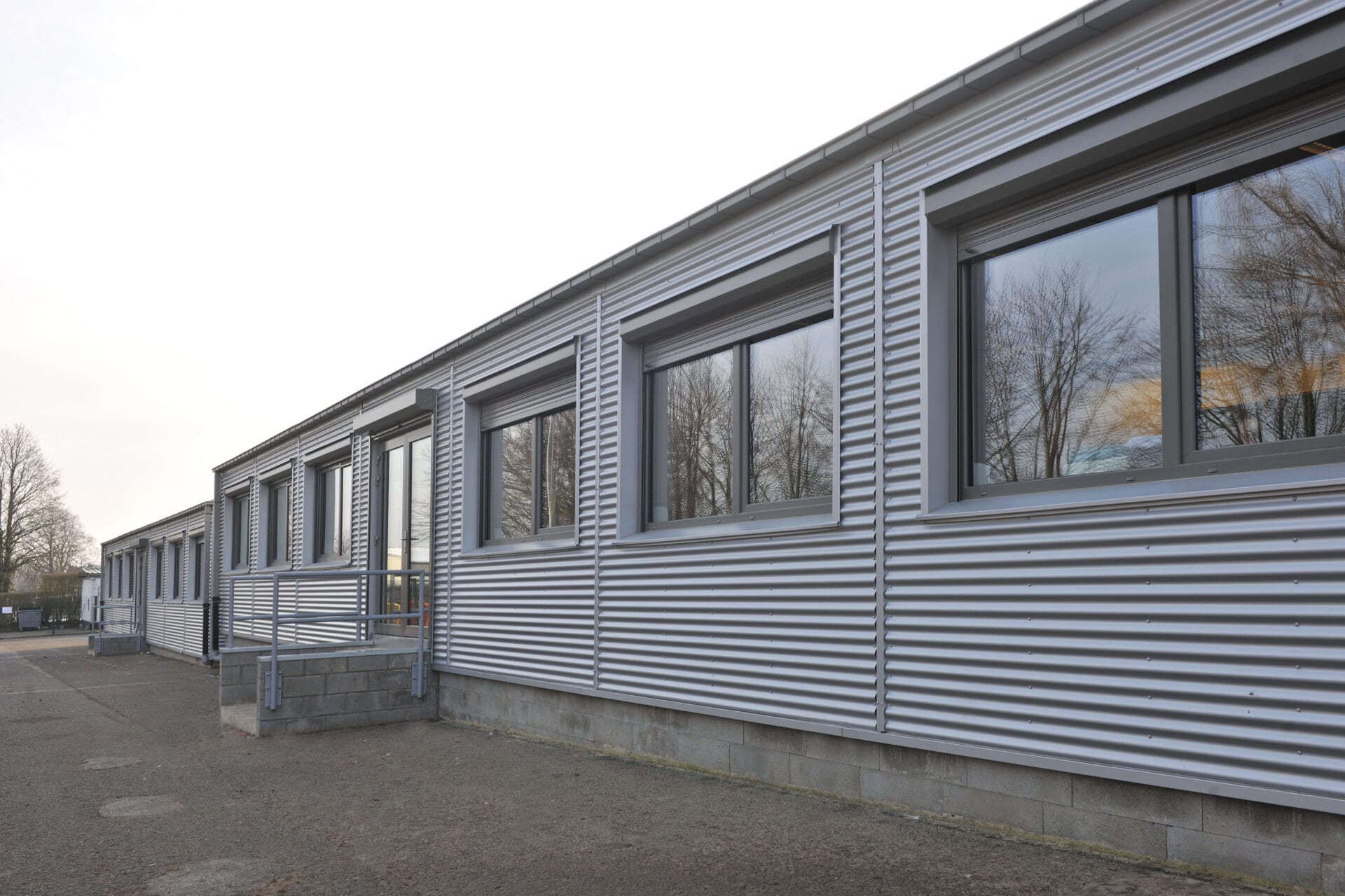 2 bâtiments modulaires avec chacun deux classes avec hall central et sanitaires, bardage en tôles ondulées, pompe à chaleur, revêtement de sol en linoléum