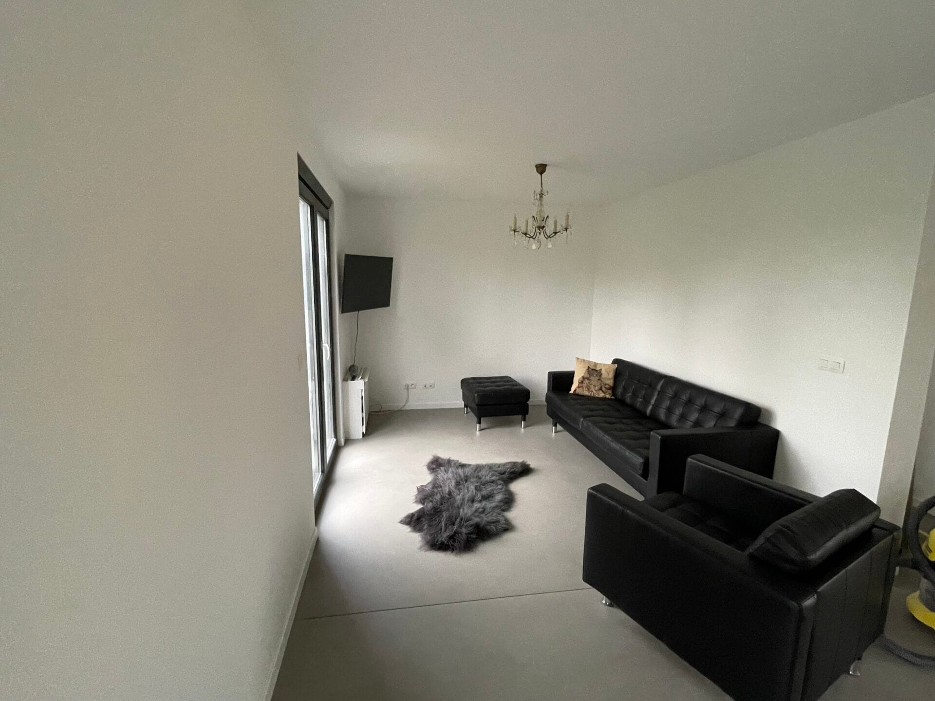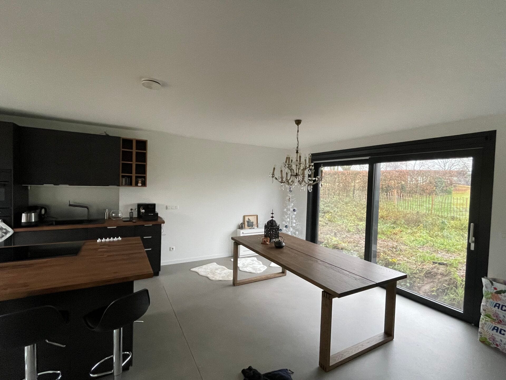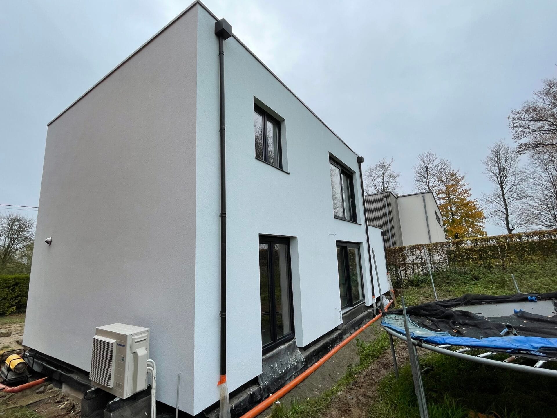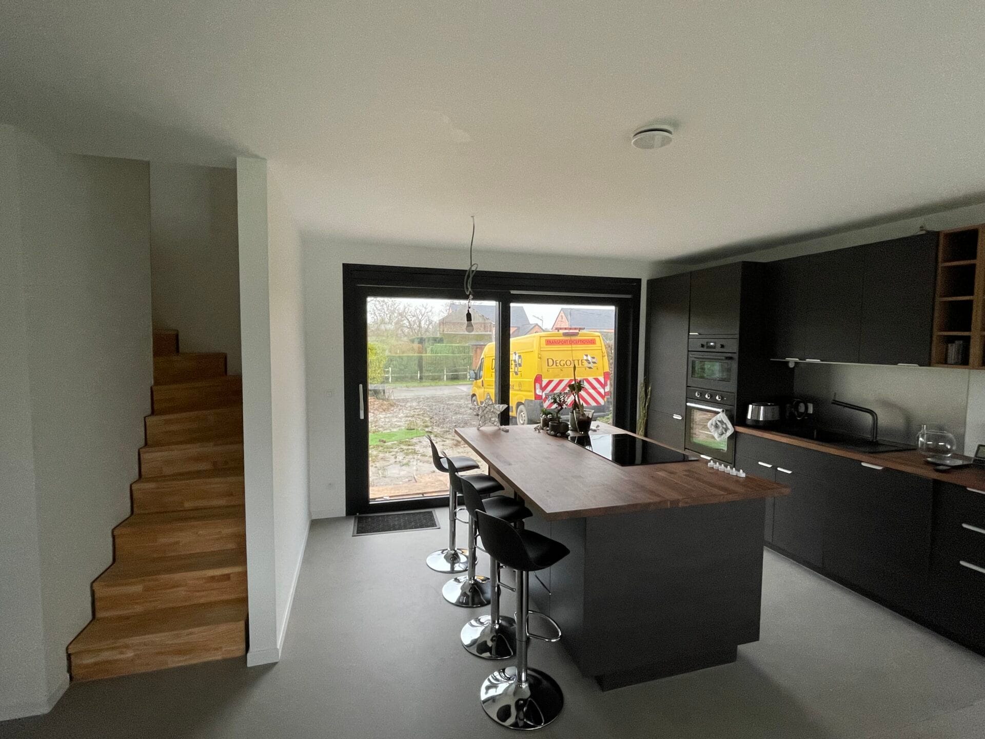 Maison d’habitation unifamiliale 4 façades avec Car port, revêtement crépi, grands châssis coulissants, béton ciré, cuisine équipée, escalier