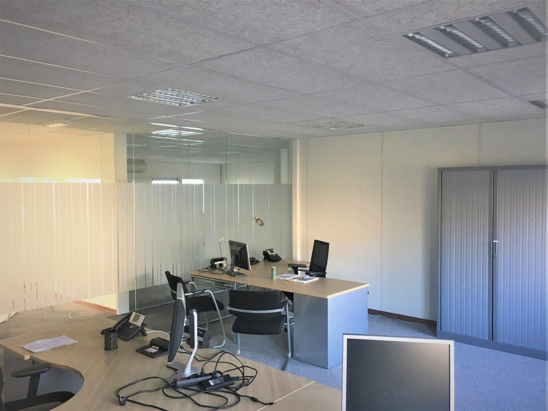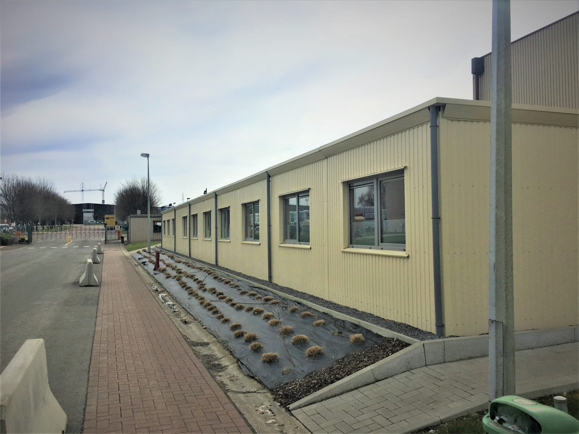 Pavillon modulaire de bureaux avec cloisons vitrées, pompe à chaleur, ventilation placé sur un site industriel