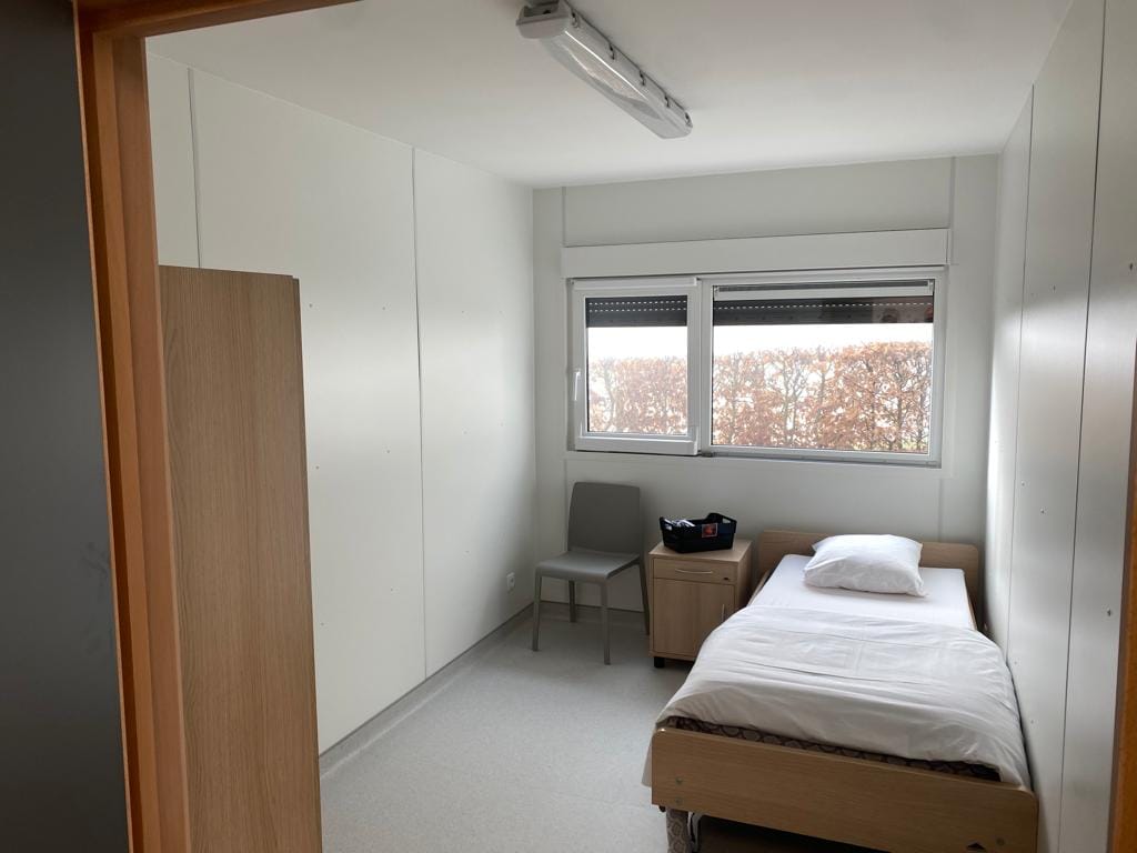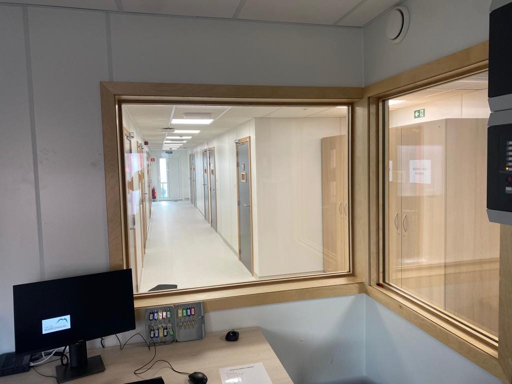 Pavillon modulaire avec chambres à destination d’une maison de soin avec sanitaires intégrés (douches, WC, etc.) ventilation, chauffage.