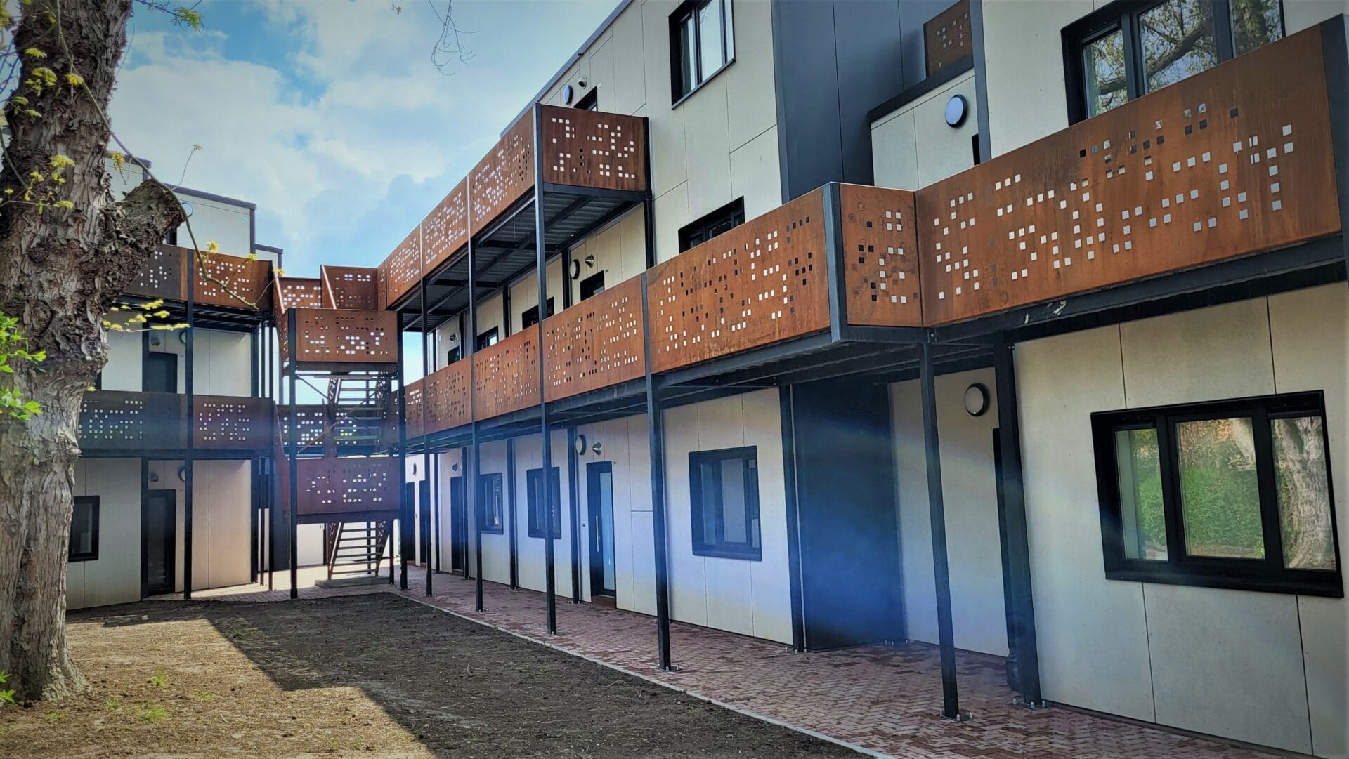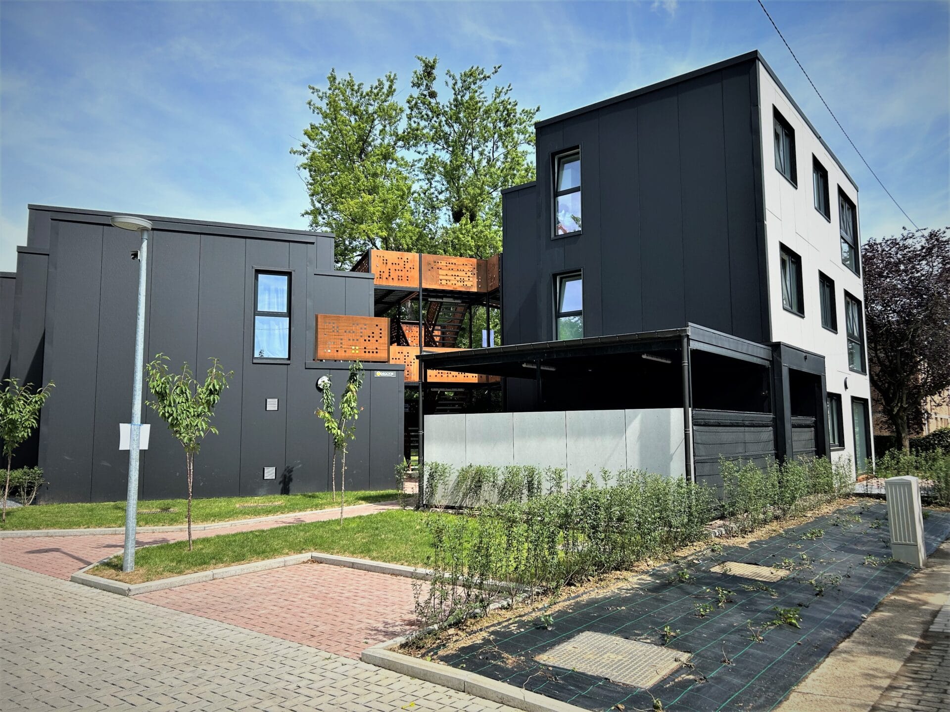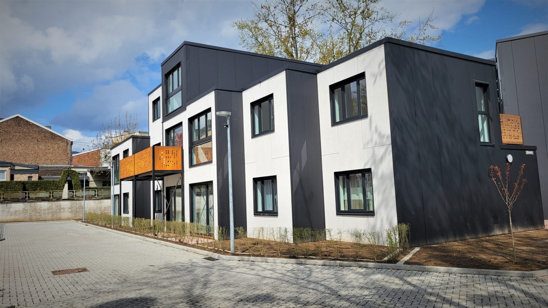 Design & Build pour la Société Régionale du Logement de Herstal, réalisation de 10 logements avec coursives, bardage fibrociment, fondations, abords, grandes baies vitrées, terrasses, … Bureau d’architecture : ASSAR Architects