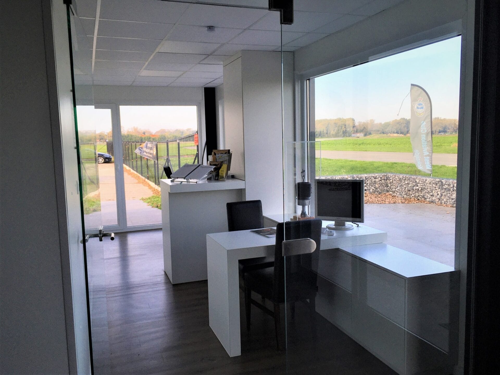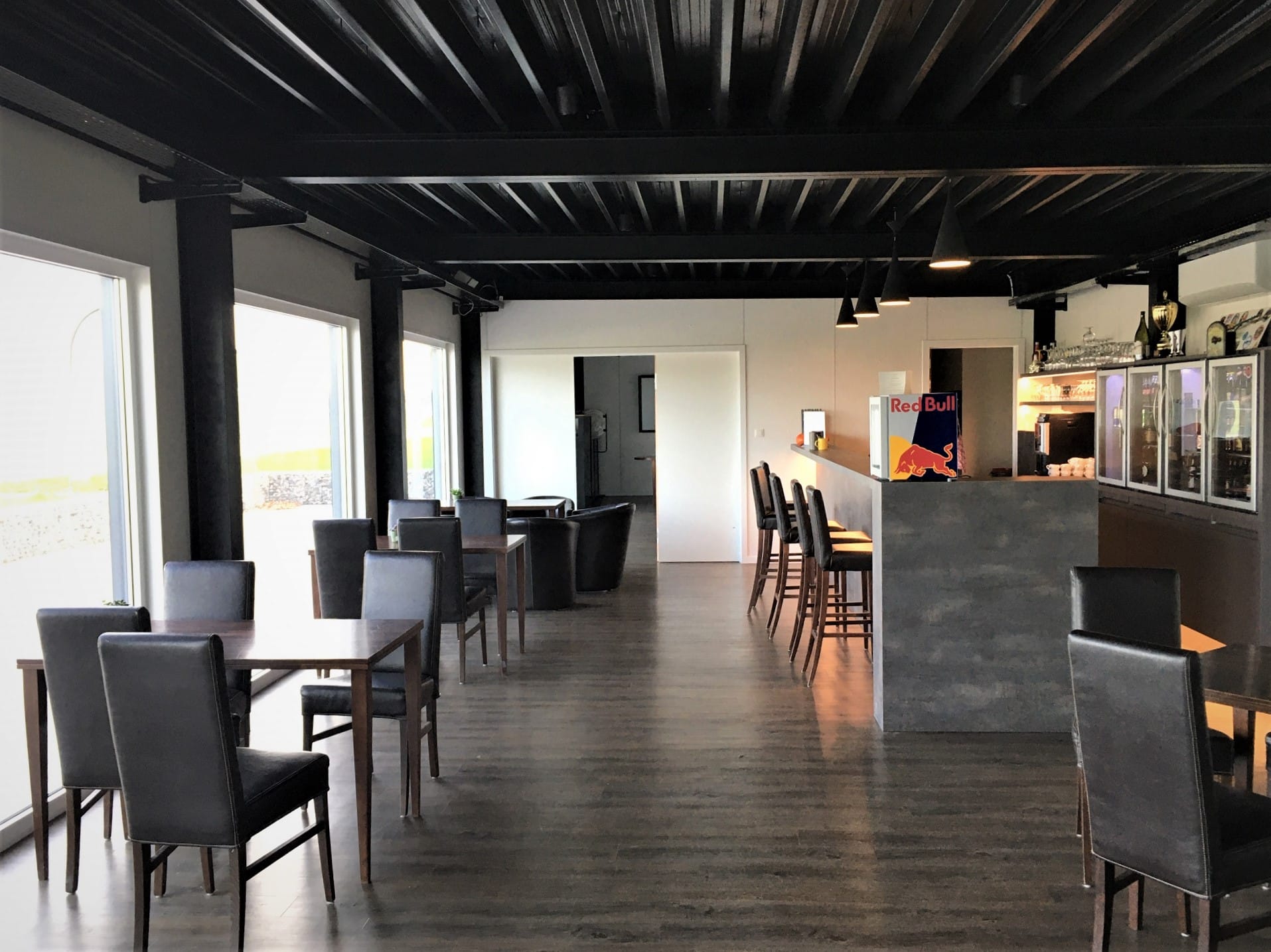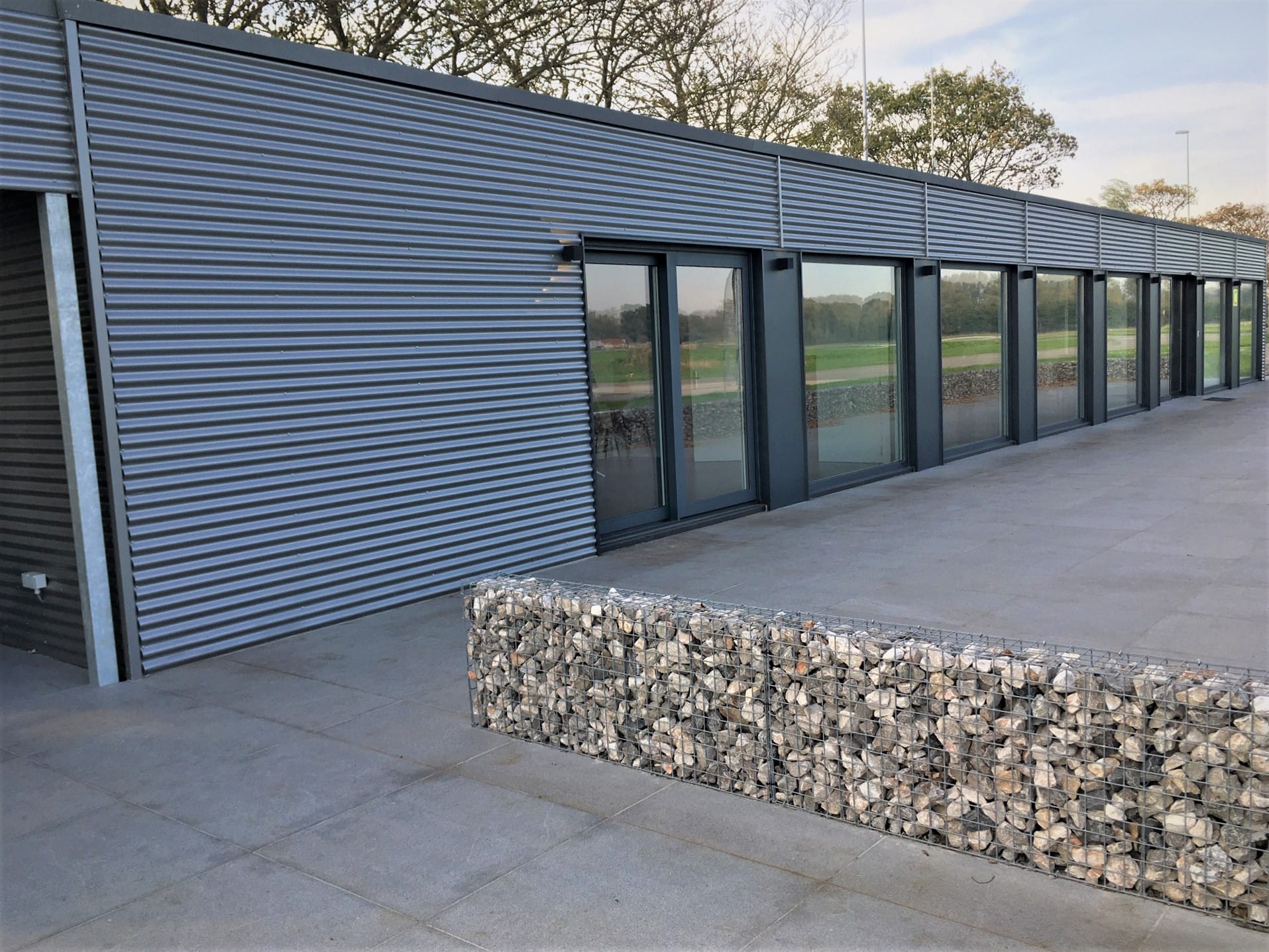 Club House réalisé pour la club d’aviation de Koksijde (Coxyde) avec plancher béton et look industriel, tôle ondulée, grandes baies vitrées