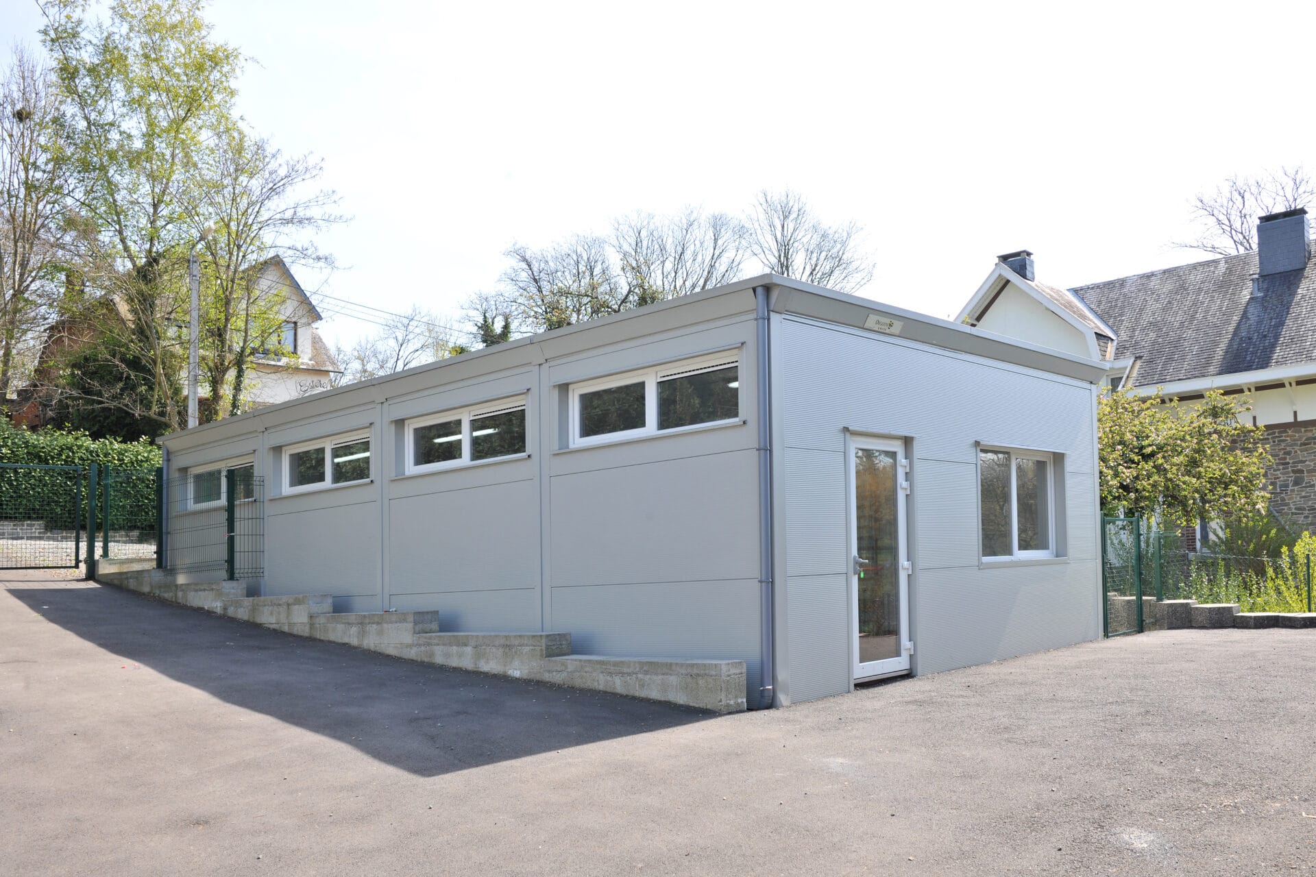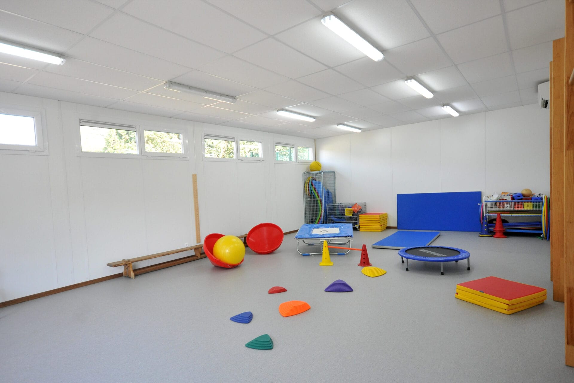 Salle de psychomotricité modulaire avec revêtement de sol réalisé sur site, pompe à chaleur air/air, hauteur sous plafond de 2M70